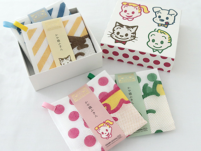 こちらは奈良の老舗、株式会社中川政七商店とのコラボが実現。愛らしいキャラクターのかや織ふきんができました。