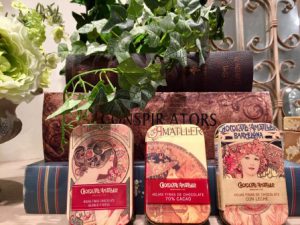 スペイン最古のチョコレートブランド”アマリエ”より、アルフォンス・ミュシャが描いた絵画パッケージのチョコレートです。