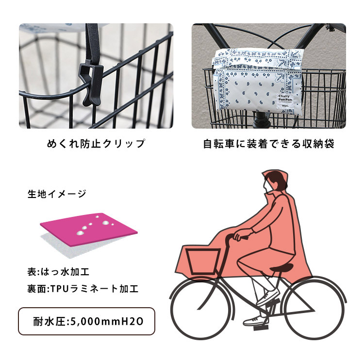 自転車を安全に、快適に乗るために考えて作られたレインポンチョです。ポンチョを上からかぶっていただいて、フロント部分を前カゴに被せて止めるだけの簡単ステップで着衣できます!