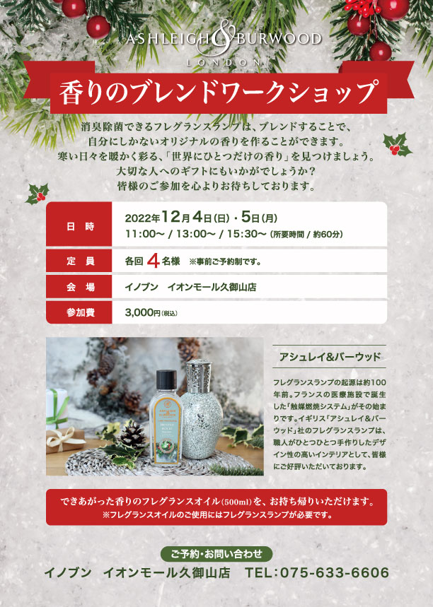 イノブン久御山店でも、大人気の アシュレーバーウッドのフレグランスランプの専用の、オイルランプのブレンドワークショップです。