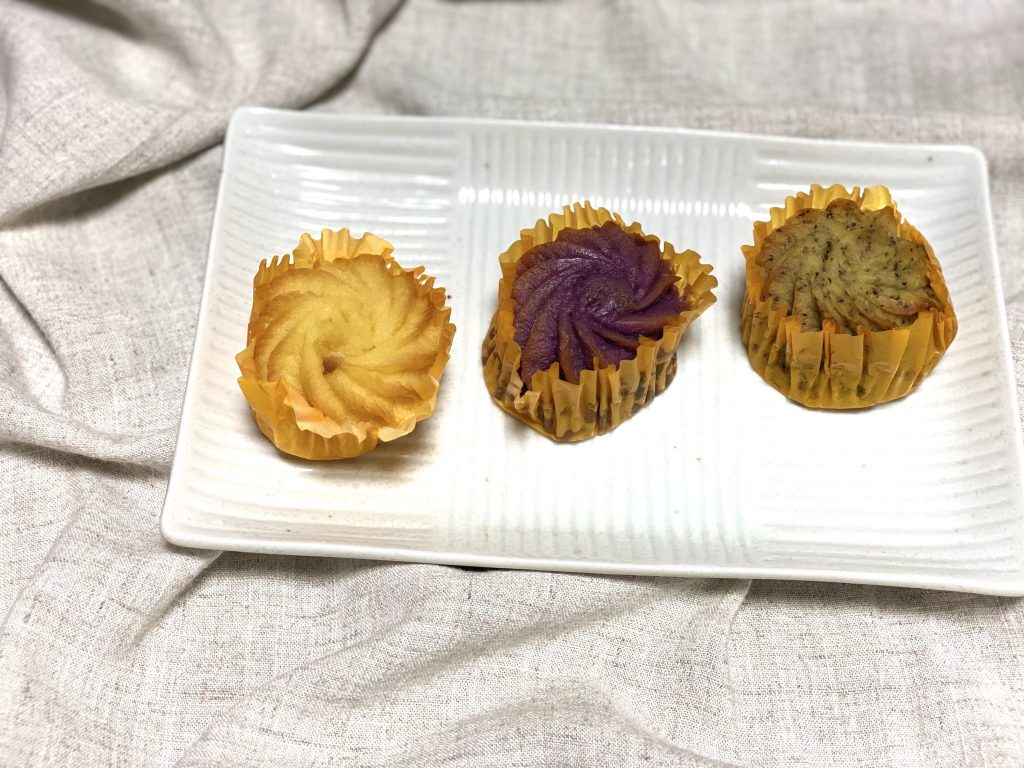 〈左より ・プレーン ・むらさき芋 ・紅茶〉