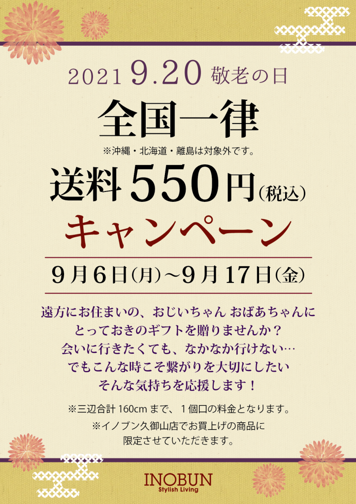 9月6日(月)~9月17日(金)まで全国一律で送料550円(税込)キャンペーンを開始します。