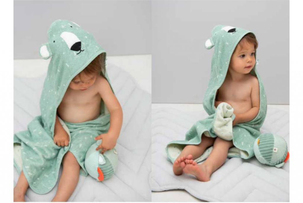 お子様の体を拭くタオルは吸収性に優れた高品質テリークロス(タオル生地)になっています。濡れた体を素早く拭き取り、お子様に快適さを提供します。