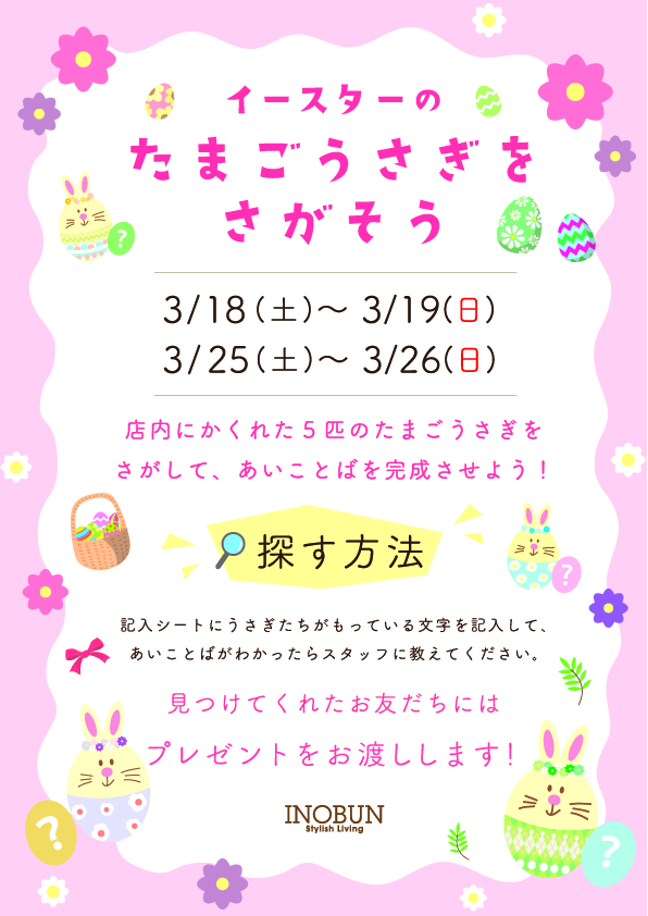 イノブンでは、カラフルなたまごの形をしたウサギたちが店内にかくれんぼ!