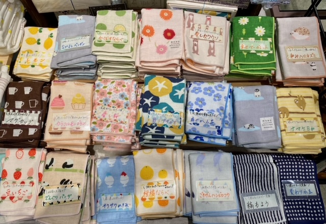 店頭では、こちらの手ぬぐいタオルと和タオルを扱っております♪