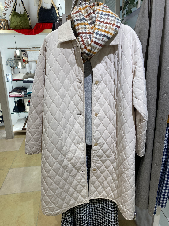 こちらロング丈です。今年はコーデュロイの襟が付きました!この襟がなんといっても可愛いんです♡カジュアルになり過ぎず、キレイめにも使えるキルティングは一つは持っておきたいアイテムです。