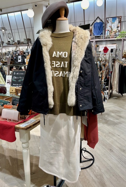 中のニットは鏡文字で「オマタセシマシタ」と書かれた、くすっと笑える一枚。
