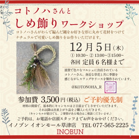 イオンモール草津店では12月5日(木)にお正月に向けたナチュラルで素敵な「しめ飾りワークショップ」を開催いたします♪