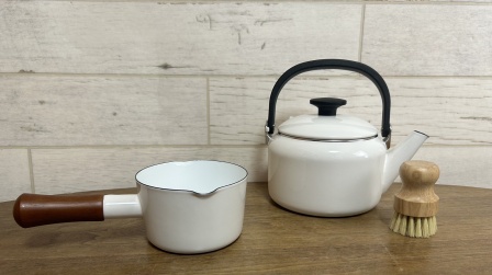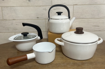 お料理に大活躍する富士琺瑯のミルクパン・片手鍋・両手鍋・ケトルの4点セットです。