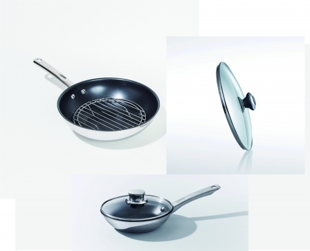 炒め鍋としても蒸し器としても使用可能な深型フライパン26㎝、蓋付きフライパン18㎝、蒸し器、ガラス蓋の4点セット