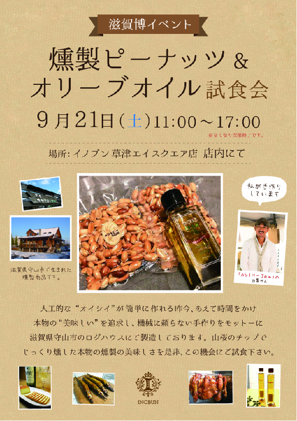 9月21日(土)守山のログハウスで作っている、カントリーJamの燻製ピーナッツ&オリーブオイル試食会