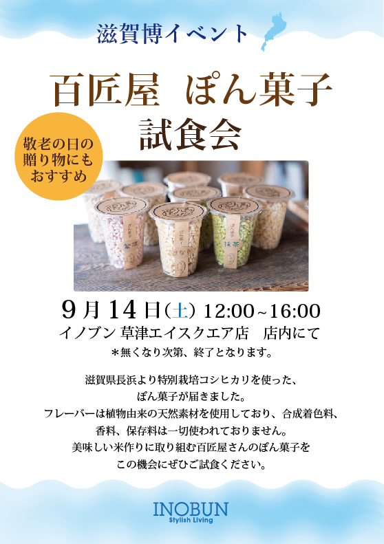 9月14日(土)滋賀県長浜より、特別栽培のコシヒカリを使った百匠屋のぽん菓子試食会