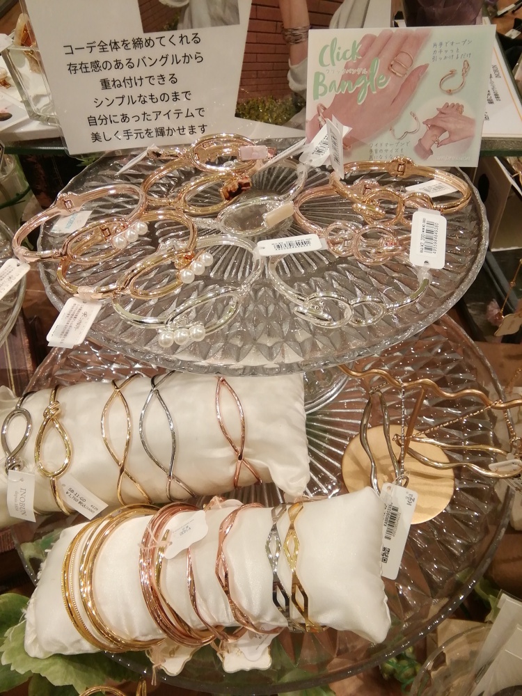 クリア素材のブレスレットは涼しげなコーデに合わせたいですね。