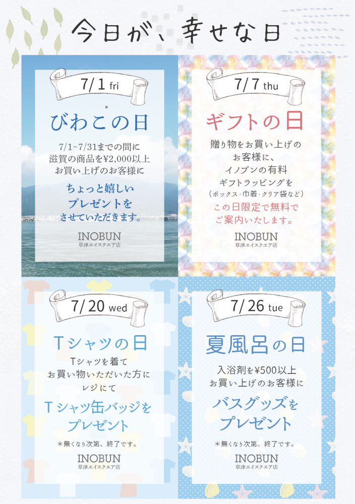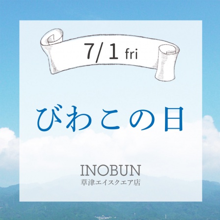 びわこの日は1日だけでなく、7月1日から7月31日の間に、イノブン草津エイスクエア店にて、滋賀の商品を税込み¥2000以上お買い物していただいたお客様にちょっと嬉しいプレゼントをさせていただきます。