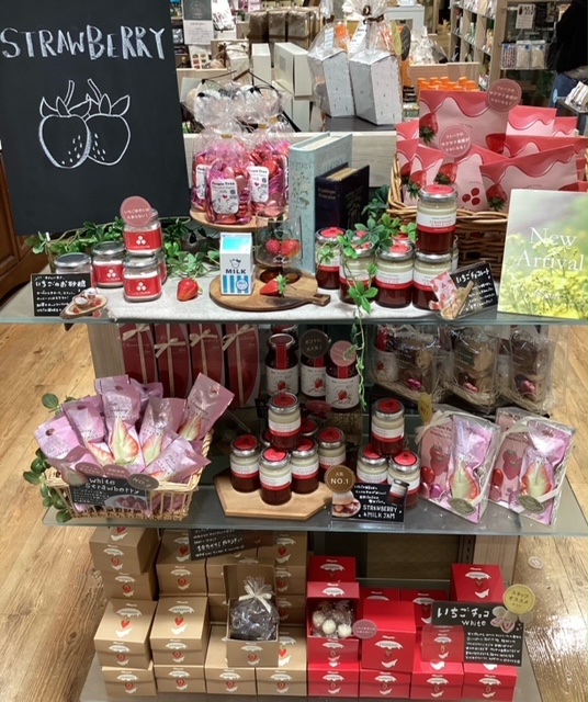 お店のいちごコーナーです。いちご商品がたくさん並んでいます!