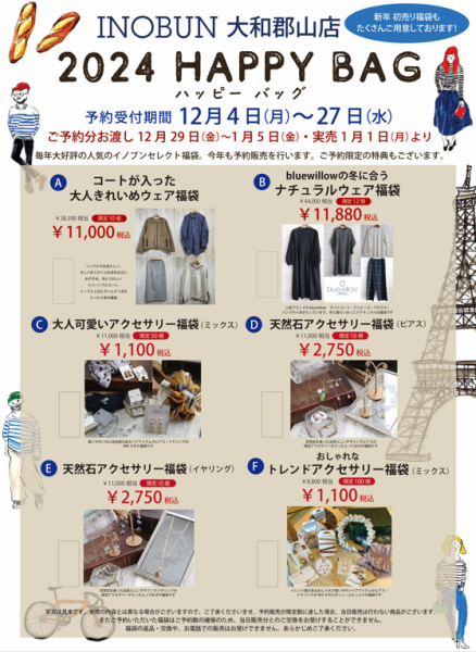 本日はイノブン大和郡山店より、来たる2024年の幕開けを飾る、嬉しい福袋予約のご案内です。明日12月4日より予約が始まります。