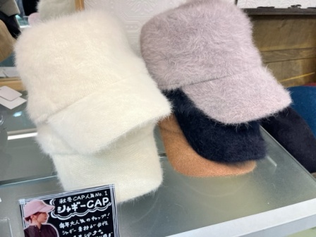 こちらは、イノブン四条本店で大人気、シャギーキャップです。可愛すぎず、カジュアルすぎない、シャギー素材×キャップの組み合わせが使いやすく、おすすめです!