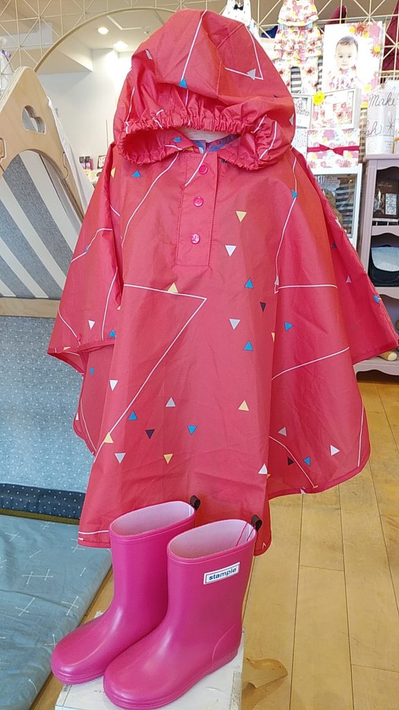 フードにギャザーがついていて脱げにくいので、少しの雨ならこれプラス長靴でお散歩に行けます♪