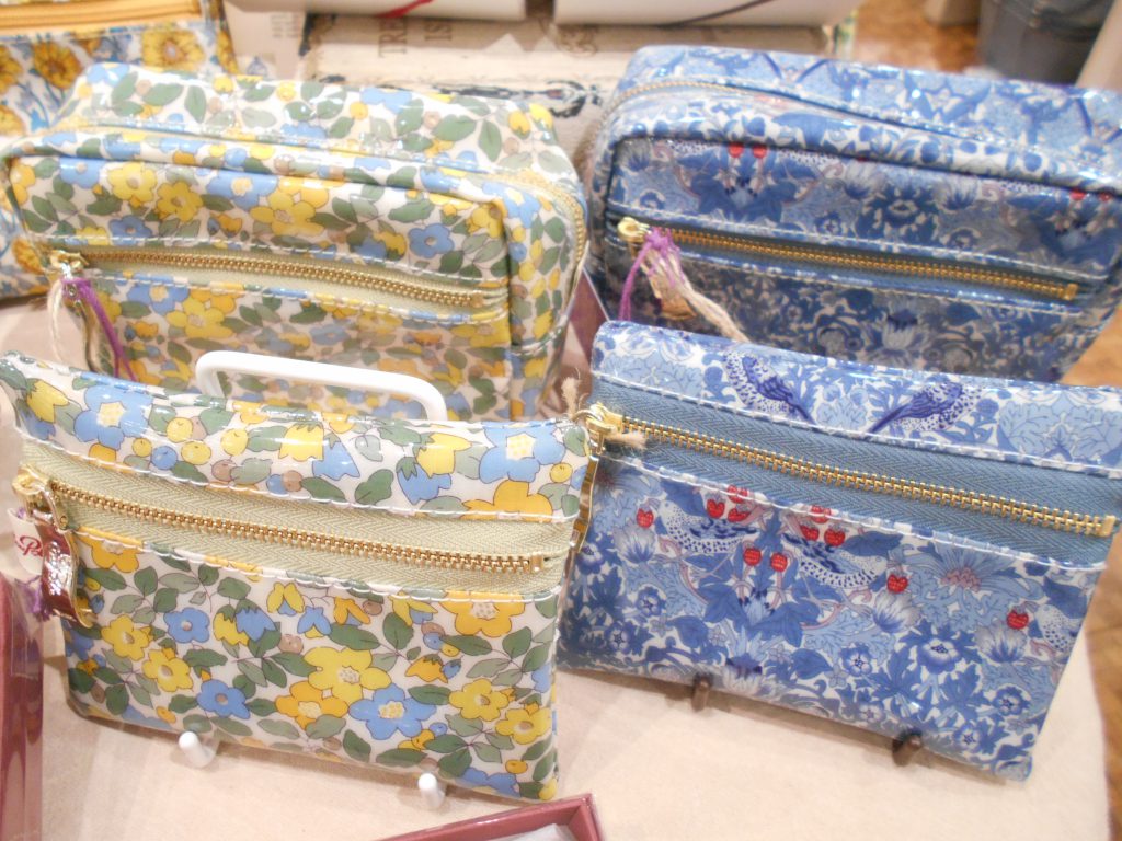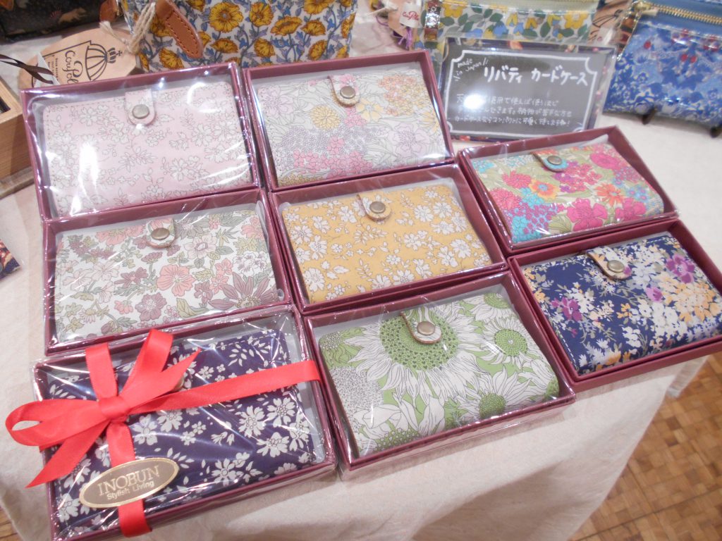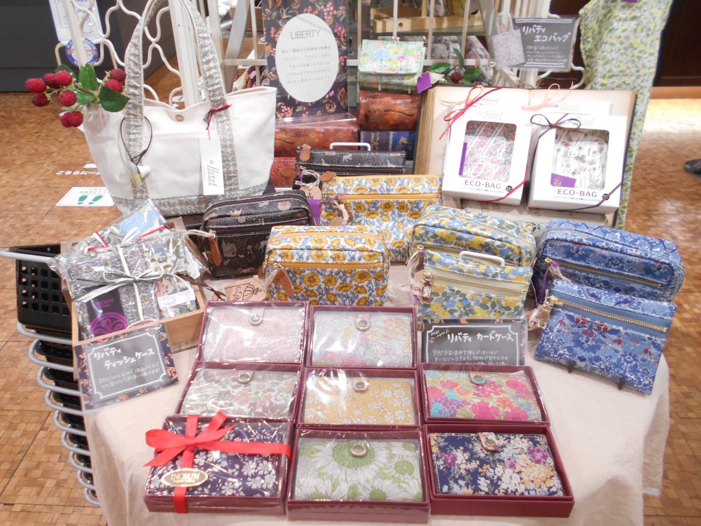 天満橋店ではポーチの他にも、ハンカチやスマホケースなどお出かけに使えるアイテムや、クッションやティッシュカバーといったおうちを彩るリバティアイテムも取り揃えております。