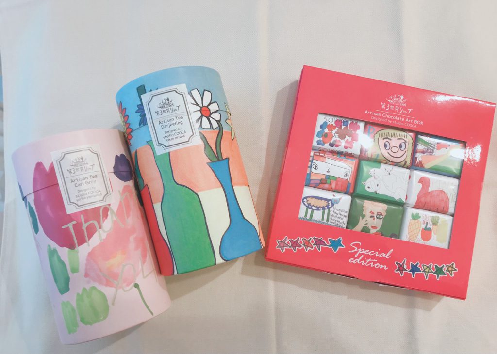 そして左にあるピンクのBOXチョコレートは9種類のアートワークが描かれた限定商品・・・!9人のアーティストが個性豊かなデザインを描き、みなさまのもとへ美味しいチョコレートと一緒にお届け!