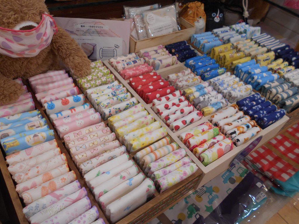 ミニハンカチで作ったマスクをしたモンブラン君が店番してくれてます