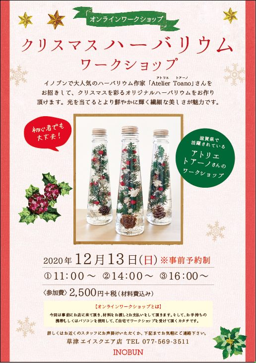 本日は「オンライン ハーバリウムワークショップ」のお知らせです。