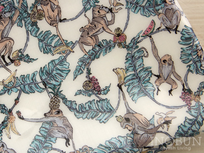 淡い色彩で描かれた美しい植物柄に、よく見ると果物とサルたちが。