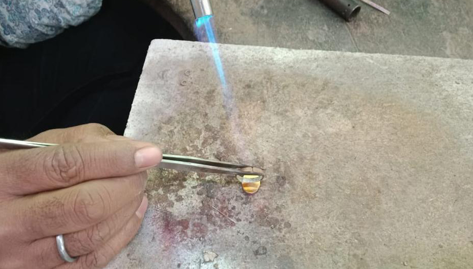 石が磨かれ土台となる地金に取り付けられていくところです。
