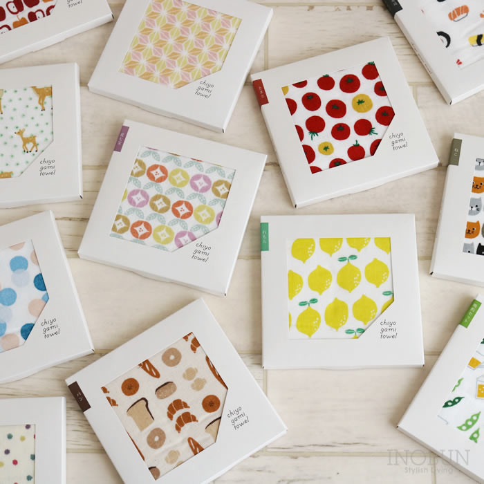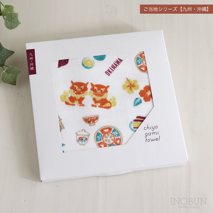 千代紙タオルのご当地シリーズから、日本の南国、九州沖縄デザインのタオルです。九州沖縄地方にある県のアイコン的な食べ物やモチーフが描かれています。