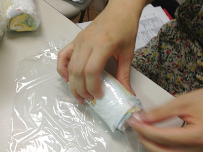サンドイッチのロールケーキをつくる要領で、くるくるっとおむつを巻いて、土台をつくります。