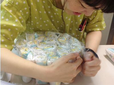 そして、おむつたちをケーキの土台として使うために、こんな風にラップでくるっとまとめます!