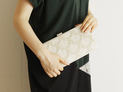 式のお呼ばれスタイルに必須なのがパーティーバッグ。