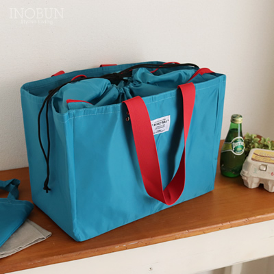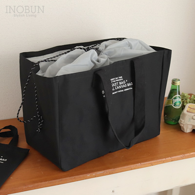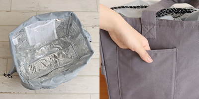 ◆間口に巾着、内側には保冷保温効果の銀面シート+メッシュポケット付◆