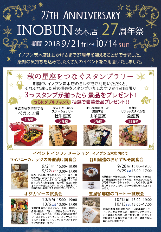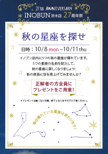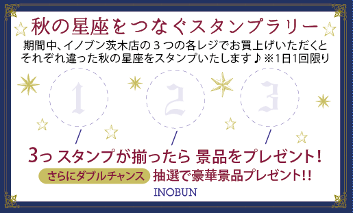 周年祭期間中、イノブン茨木店の各レジをご利用いただくと、それぞれ違った秋の星座をスタンプいたします!(1日1回限り)