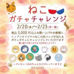 税込3000円以上お買い上げのお客様にイノブンオリジナルねこの缶バッジが当たる、ガチャガチャにチャレンジしていただけます。