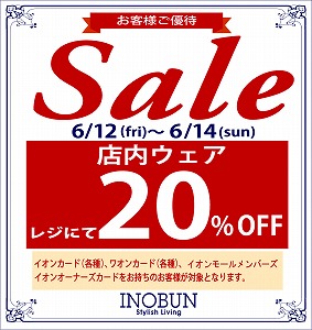 イオンカード各種、ワオンカード各種、イオンモールメンバーズ、イオンオーナーズカードを いずれかお持ちのお客様限定で店内ウェアがレジにて20%OFFに!!