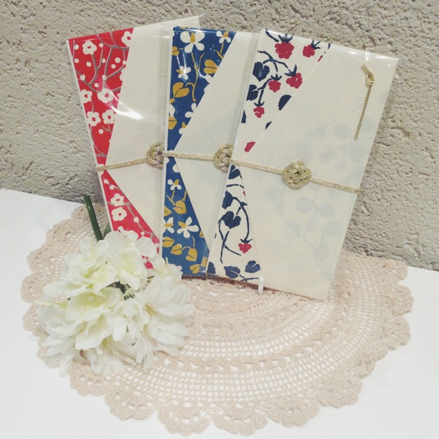梅の花を模した可愛い飾結びの水引が付いたご祝儀袋。