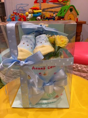 箱に入ったオムツケーキですが、この中にお好きなプレゼントを入れていただくと