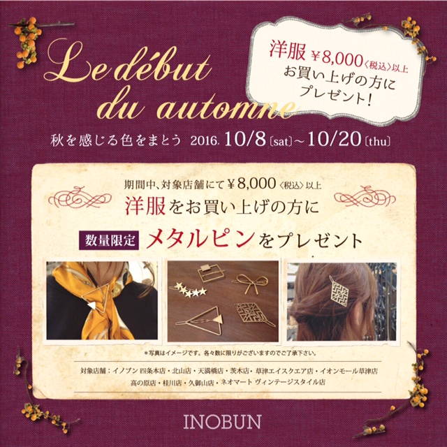 イノブン各店(イノブン四条本店・北山店・天満橋店・草津エイスクエア店・イオンモール草津店・高の原店・久御山店・桂川店・茨木店・ネオマートヴィンテージスタイル店)にてお洋服を税込み¥8000以上お買い上げのお客様に、秋のオシャレにぴったりな「メタルピン」をプレゼントいたします!