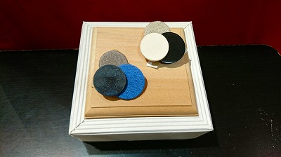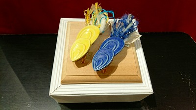 ウロコ風陶ボタンにナチュラルなリネン生地とカラフルな糸の組み合わせが楽しい熱帯魚をイメージしたコサージュです。