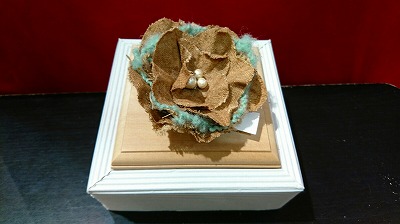 シンプルなフォルムが可愛く、麻と真鍮または麻と陶、レザーの異素材の組み合わせが楽しいコサージュです。