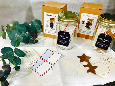付属のダイカットのカードにメッセージを書いて、ガラス瓶に入れてギフトにできる寄せ書きセットです、