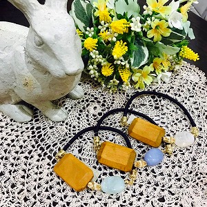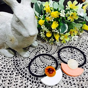 長方形の木と合金とソープストーンで作ったヘアゴムです。