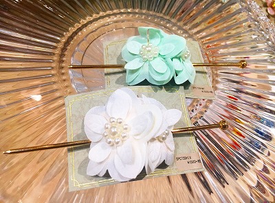 ヘアピンの方は一つに5種類の色のお花が使われているので、これ一つ髪にとめてもらうだけで華やかになること間違いナシです。