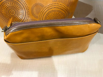 バッグの中身の収納に使っていただけるだけでなく、取り外せる付属のショルダーを付けていただくと、こちらも斜めがけにできるんです。