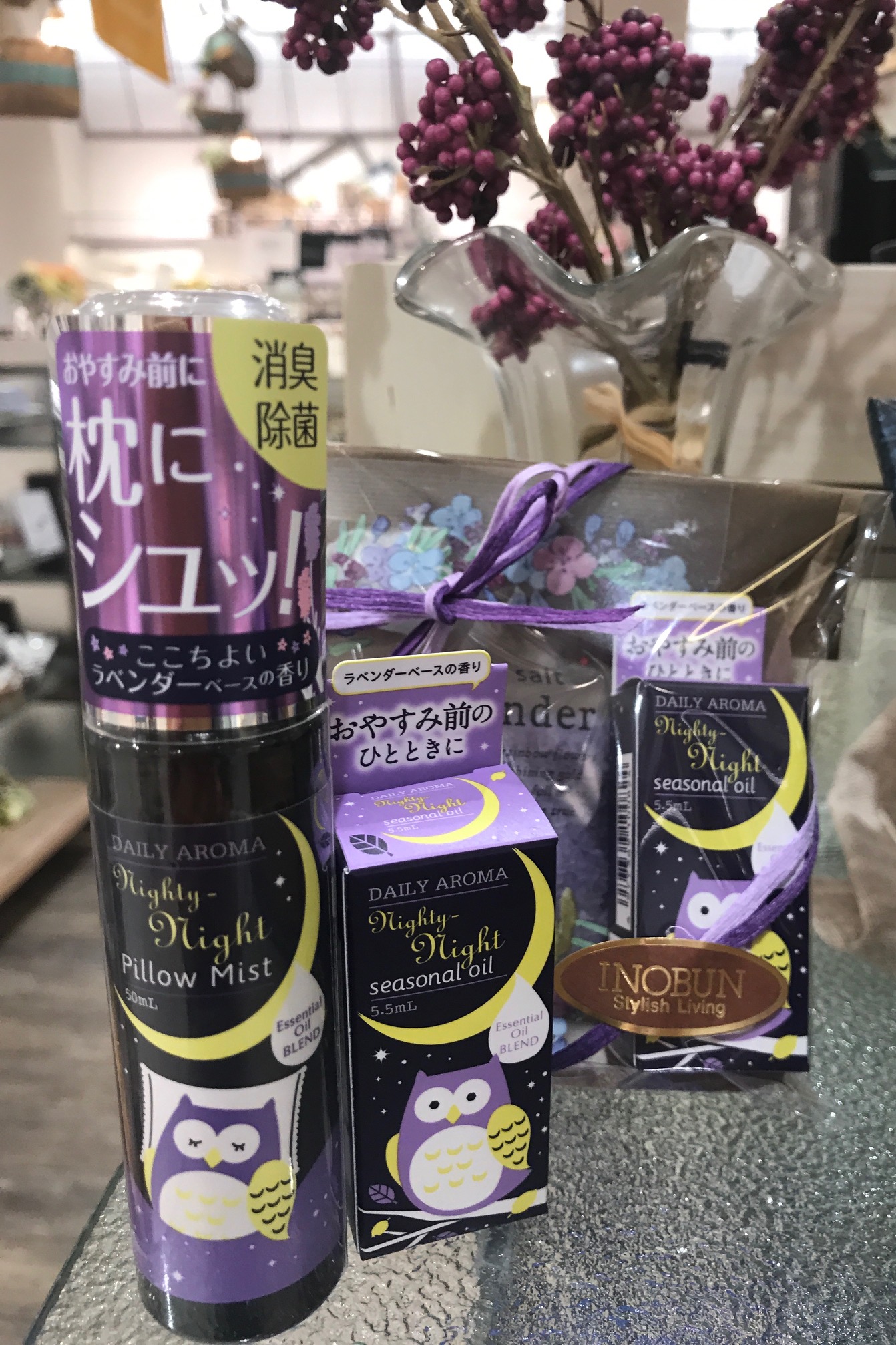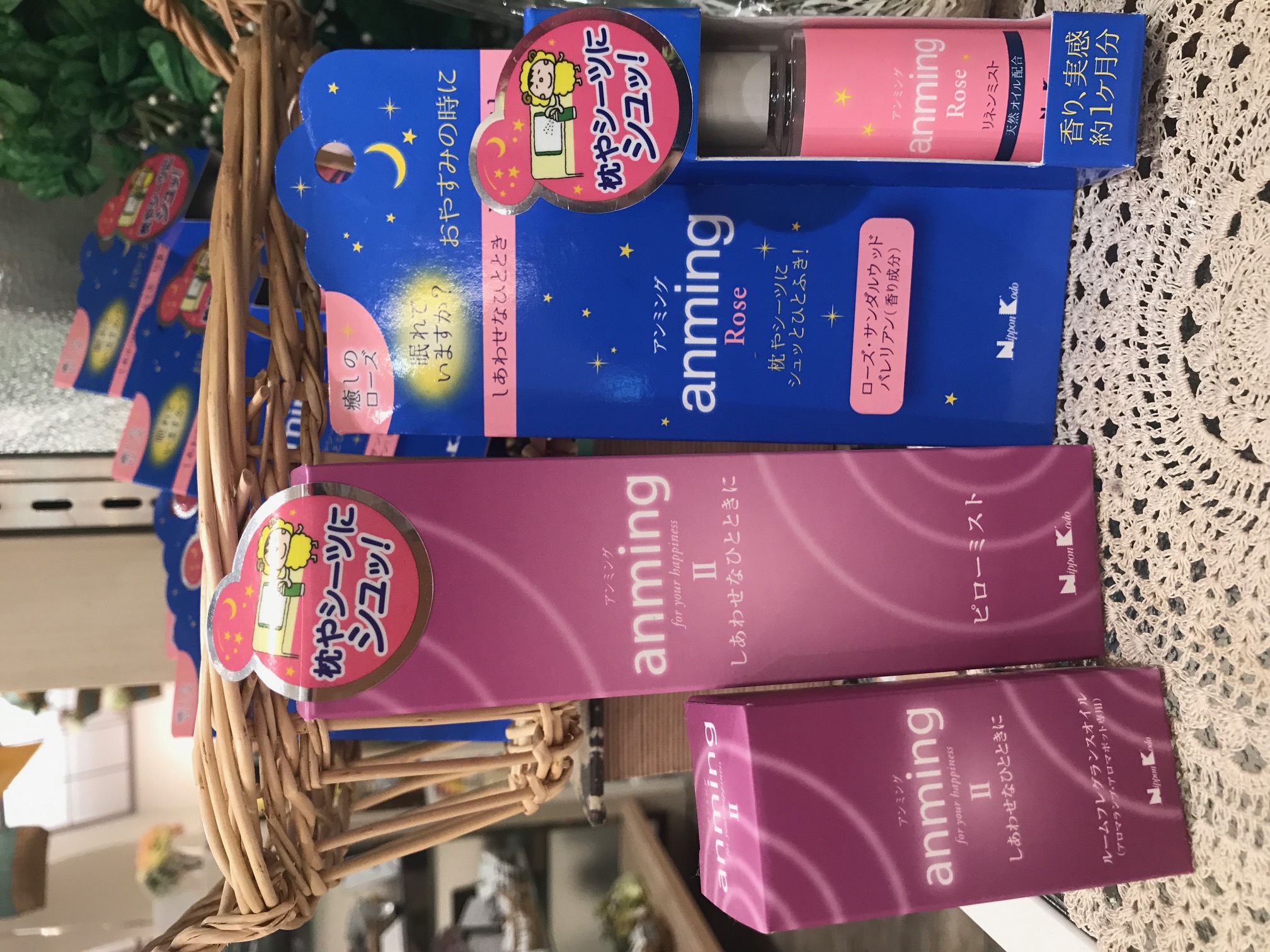 “おやすみ前のひとときに” ナイティーナイトシリーズより、 ピローミストと、アロマオイル。 ピローミストは、枕にシュッとして、 消臭・除菌もできる、優れもの! お次は、大人気、 アンミングシリーズ。 人気No.1
