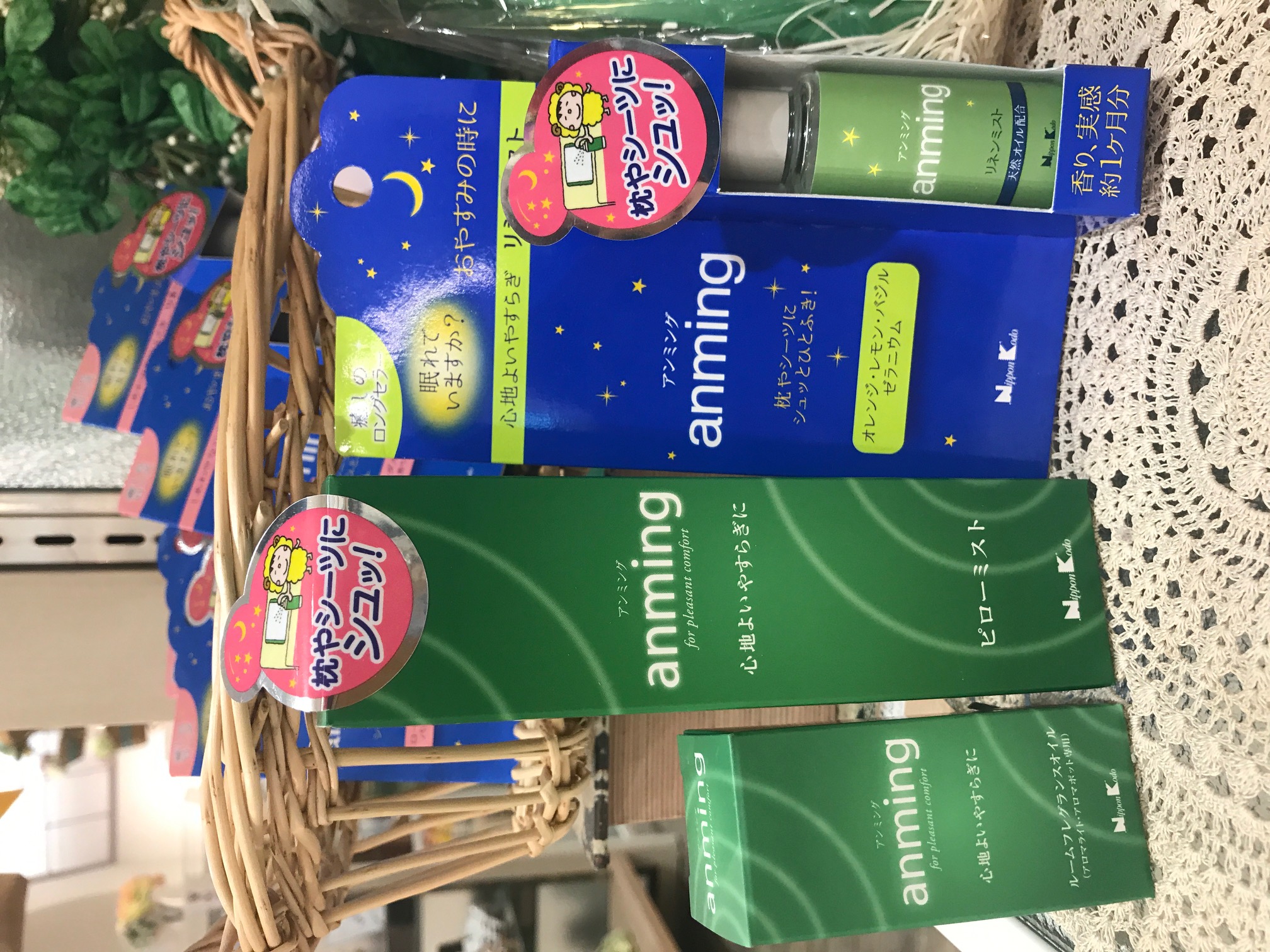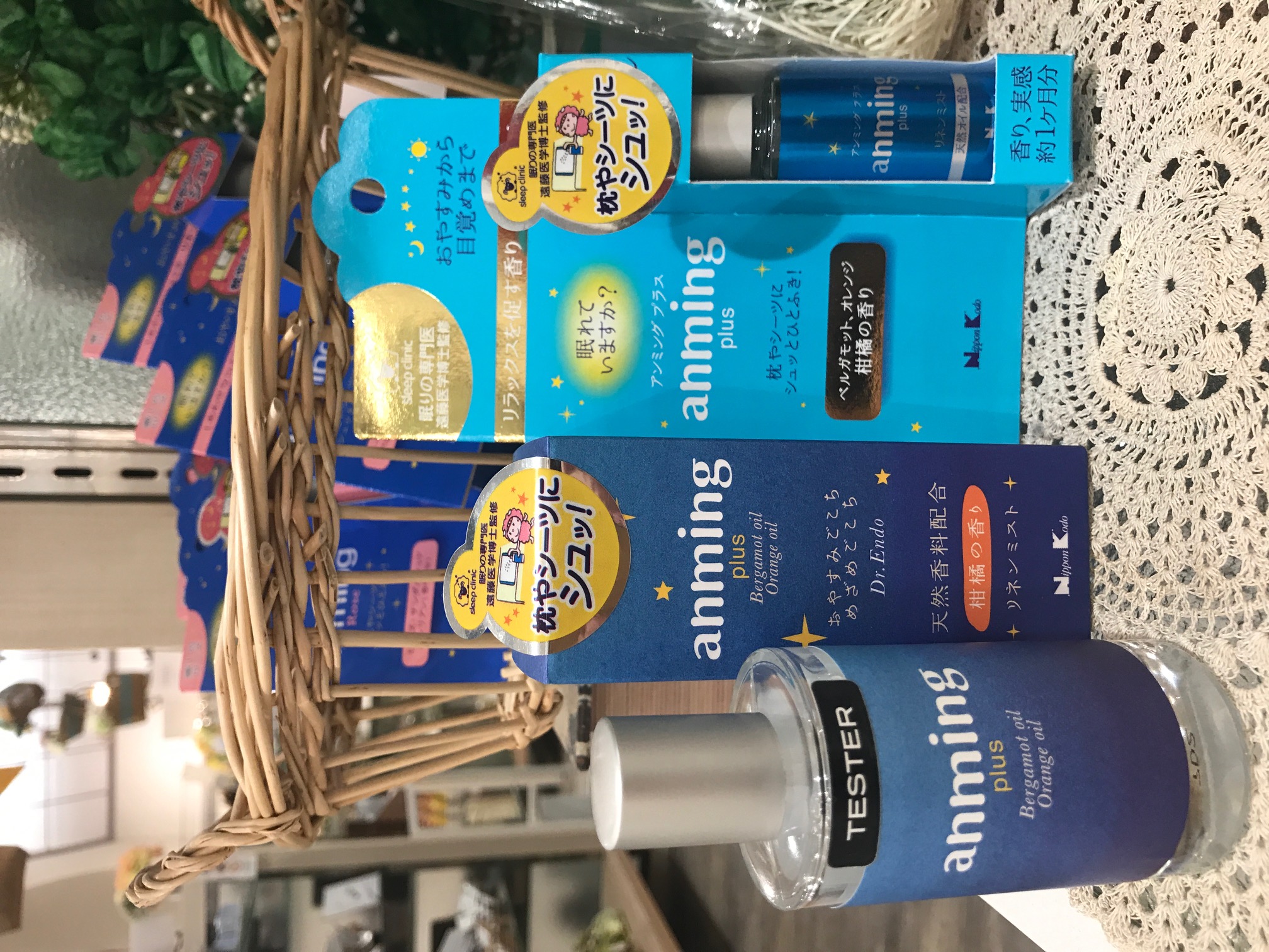 “アンミングプラス” 眠りの専門医監修の、柑橘系のやさしい 香り。 寝る前だけでなく、目覚めの時にも、 シュッシュッと使用できます! 私も、毎朝・毎晩使用してます。 夏の疲れがでる秋は、 たっぷり寝るのがよいそうです。 ぜひ店頭にて、香りをお確かめ下さい。 皆さまのご来店お待ちしております。