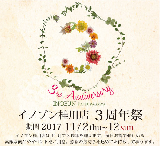 11月2日(木)~6日(月)までの5日間、税込3.000円以上お買い上げのお客様に3周年オリジナルエコバッグをプレゼント!