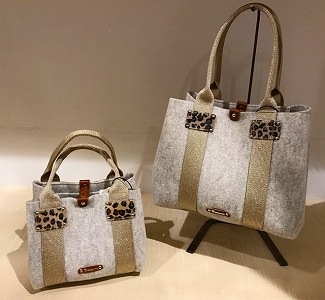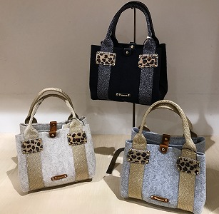 フェルトのカラーに合わせたラメテープのハンドルとカウヘアーのコンビネーションが特徴のデザインはコーディネートのアクセントにもなりますね♪