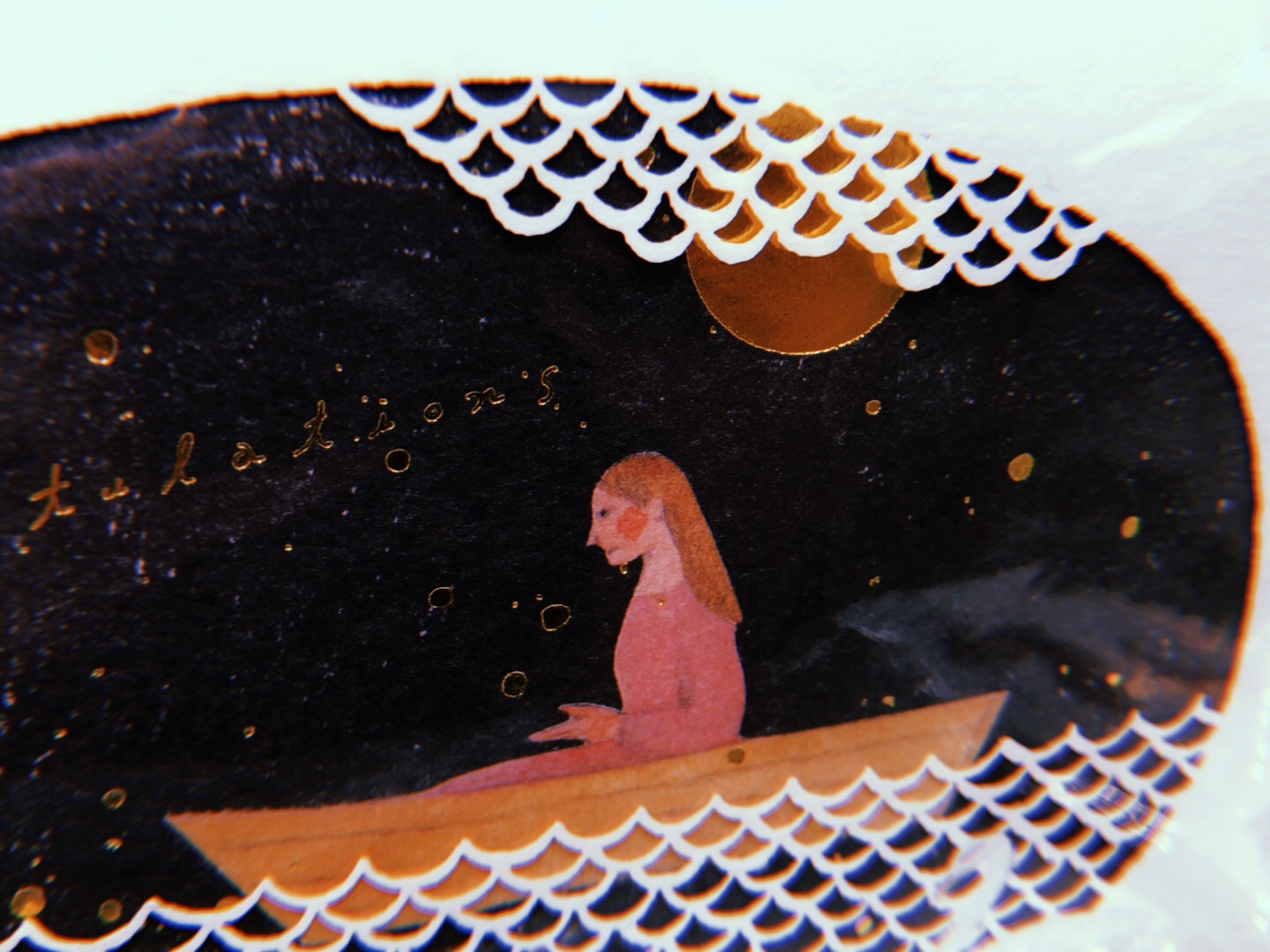 白い紙の部分は、レザーカットで繊細に切り出され、神秘的な絵をより一層引き立てています。